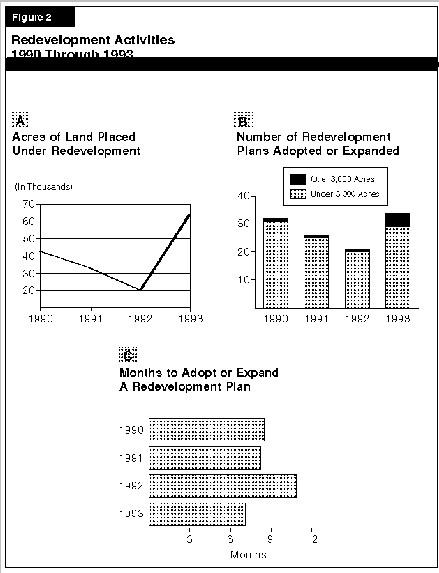 While we were not able to gauge the total time used to adopt and amend redevelopment plans in 1993, we did examine the time between two key milestones: (1) the date the local agency submitted its proposed redevelopment plan to the State Board of Equalization and (2) the date the redevelopment plan became effective. The local agencies are largely in control of the process during this period. As Figure 2-C indicates, this time period was approximately three months or 25 percent shorter in 1993 than in 1992--and roughly 10 percent (or 1.5 months) shorter than in 1992 and 1991.