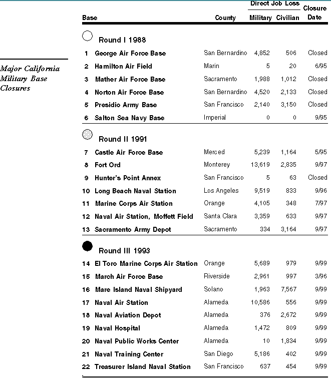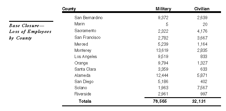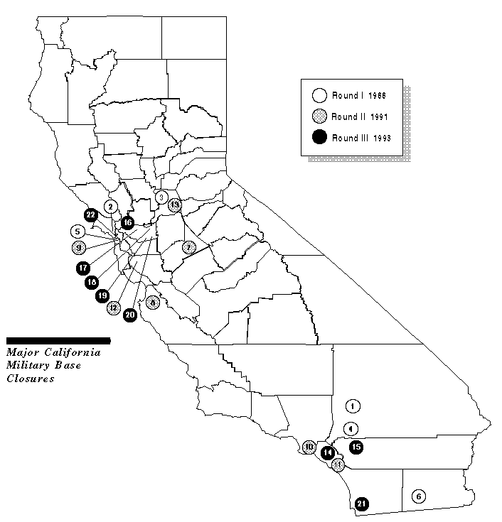 There are a total of 63 major military bases in California. Twenty-two of these bases were designated to be closed under the first three rounds of closures (1988, 1991, and 1993). These base closures will result in a direct job loss of 110,696 jobs--78,565 military personnel and 32,131 civilian employees (the total number of employees when base closures were announced).