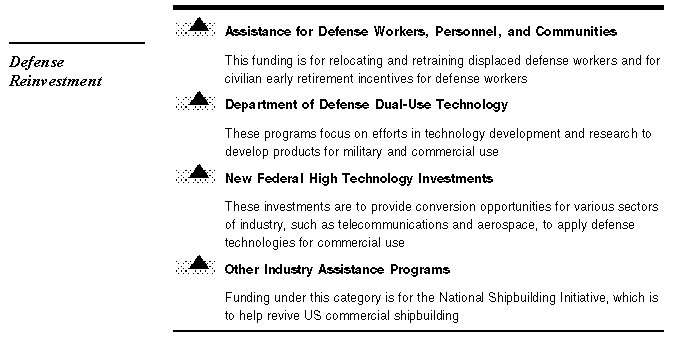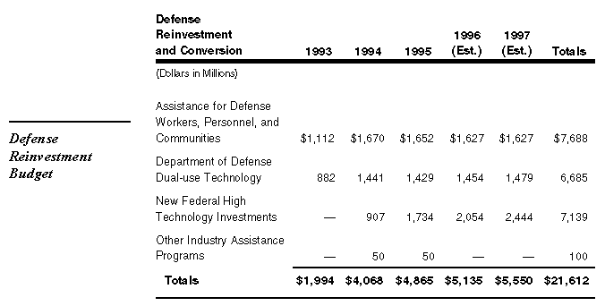 In February 1994, the Office of Management and Budget estimated that $21.6 billion would be made available over five federal fiscal years under the President's initiative for Defense Reinvestment and Conversion. The figure below shows the funding for various components of this initiative.