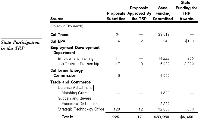 To help California's defense conversion efforts, various state departments made over $50 million available for proposals that were submitted to the TRP for federal grants. The figure summarizes the state's participation in the TRP program through October 1994. Of the $50 million the state set aside, only $6.5 million was committed to projects approved for TRP grants.