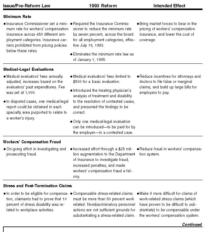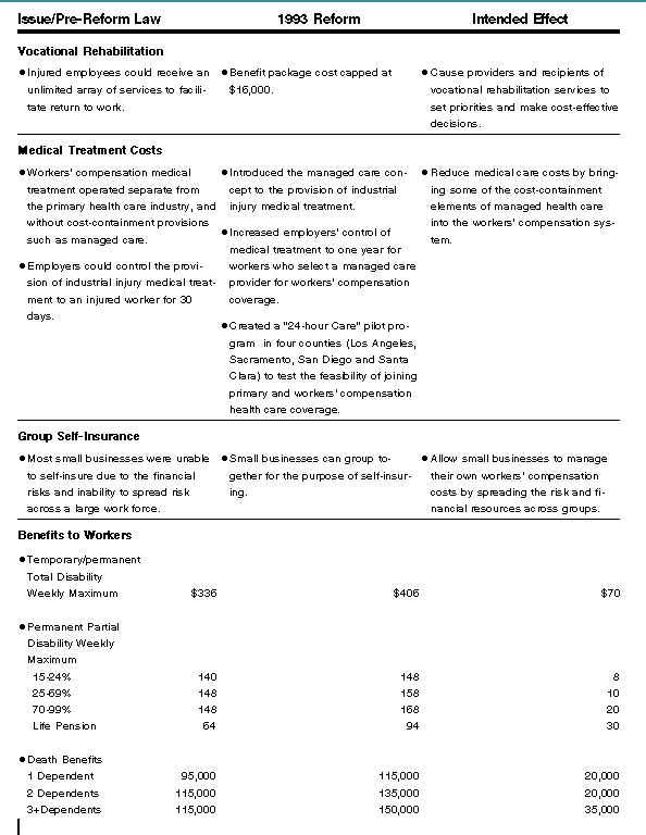 Workers' compensation reform had the overall goal of reducing employer costs while guaranteeing workers prompt and fair assistance. The individual aspects of the reform are discussed below.