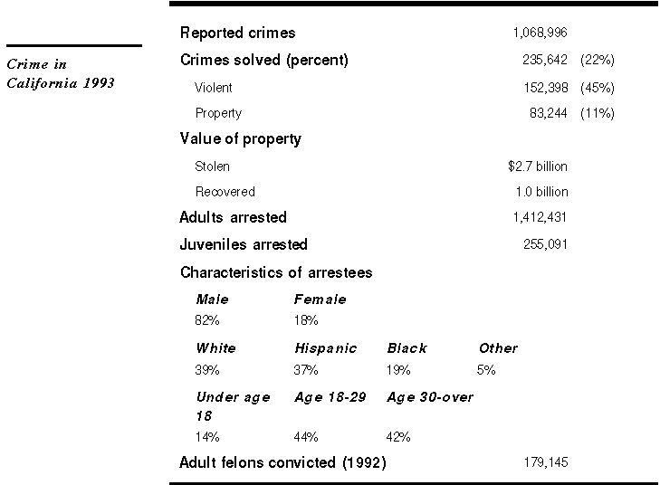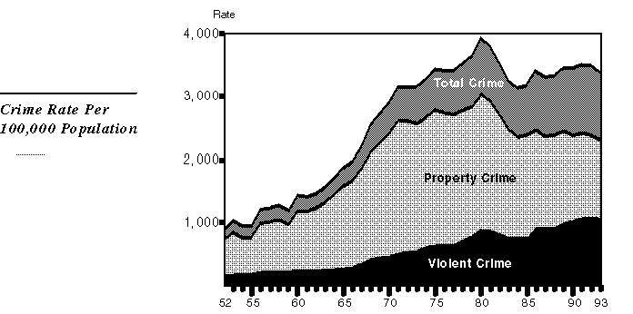 Crime data are often reported in terms of crime "rates." A rate is defined as the number of occurrences of a criminal event within a given population. For example, the overall crime rate in California (according to the CCI) for 1993 was 3,367.8, which means that there were about 3,368 crimes reported per 100,000 Californians in 1993.