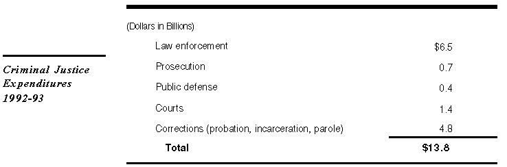 In 1992-93 (the latest full year for which data is available), the state and local governments spent about $13.8 billion to respond to crime. This amount was about the same amount that was spent in 1991-92, but represents an increase of more than 50 percent since 1987-88.
