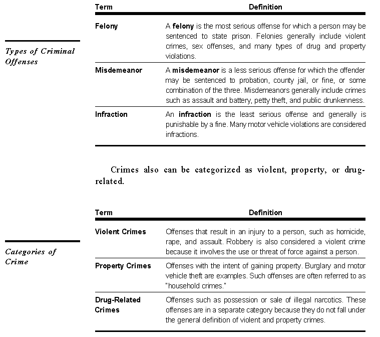 In its simplest definition, "crime" is any specific act prohibited by law for which society has provided a formally sanctioned punishment. This can also include the failure of a person to perform an act specifically required by the law. The law recognizes three broad types of crimes based on the seriousness of the offense, as shown below.