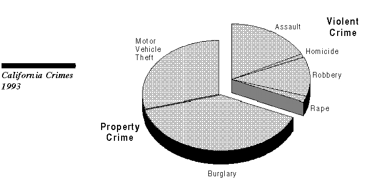 There were 3,368 reported crimes per 100,000 Californians in 1993. Property crime (burglary and motor vehicle theft) accounted for about 70 percent of all crimes reported in California in 1993 and violent crime (homicide, forcible rape, robbery, and aggravated assault) accounted for about 30 percent. The general relationship of violent to property crimes (roughly 30 percent to 70 percent) has remained stable in recent years.