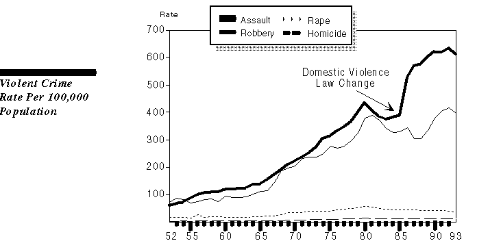 Assault and robbery account for more than 95 percent of all violent crimes reported in California. Both offenses dropped slightly in 1993 (4.8 percent for robbery and 3.4 percent for assault). The substantial increase in reported assaults that occurred in 1986 was due in large measure to enactment of legislation that reclassified domestic violence from a misdemeanor to a felony. Thus, the spike in the assault rate, and the corresponding increase in the overall violent crime rate, was not due primarily to an increase in the number of crimes committed, but rather a change in the way the crimes were reported.