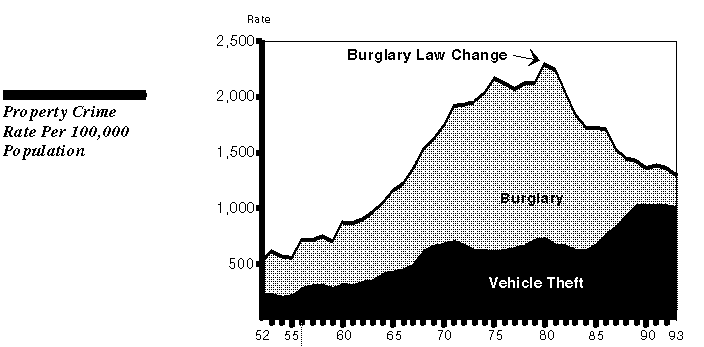 Burglaries declined substantially from a high in 1980, including a 4.5 percent drop from 1992 to 1993. Motor vehicle theft rates increased steadily until 1989 (including a sharp increase between 1984 and 1989); these rates have declined steadily since 1989. The decline in the burglary rate and the sharp increase in the motor vehicle theft rate was probably due to two factors: (1) enactment of legislation in 1980 that denied probation to offenders convicted of residential burglary, thus making motor vehicle theft more attractive, and (2) demographic changes (particularly the aging of the population).