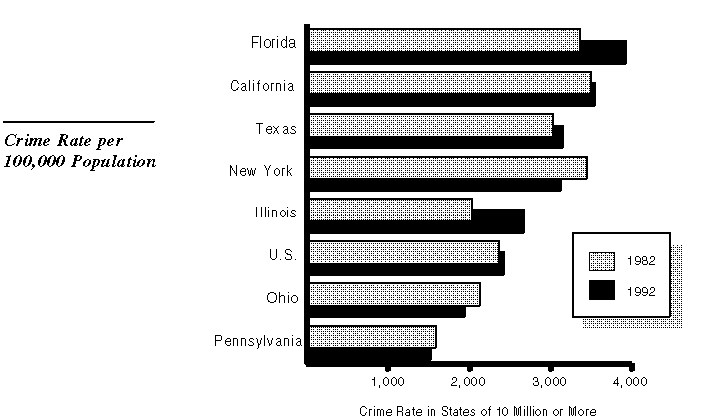 California's 1992 crime rate (the national figures for 1993 are not yet available) is higher than the rate for the nation as a whole and is the second highest among the large states (states with populations of 10 million or more). Florida's 1992 rate was the highest among the large states and was about 11 percent higher than California's rate. The highest rate in the nation is in the District of Columbia, with a rate that is almost twice as high as California's.