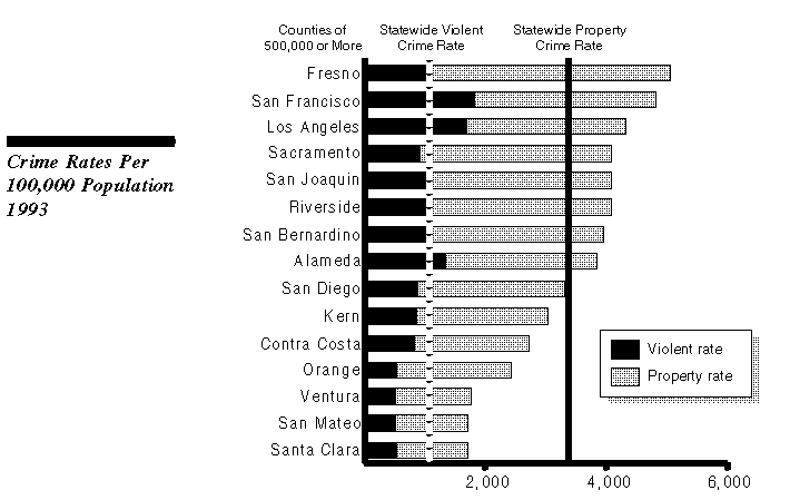 Among those counties with populations of 500,000 or more, Fresno had the highest overall crime rate in 1993--about 50 percent higher than the statewide rate. Santa Clara County's rate was the lowest and was less than half the statewide rate. These rates are largely driven by the property crime rate (Fresno is the highest and Santa Clara is the lowest). In terms of violent crime rate, San Francisco's is highest and Ventura County's is lowest.