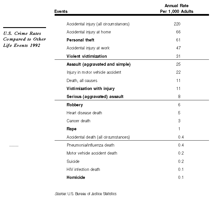 As indicated above, contrary to public perception, total crime is down rather than up in California. Persons are more likely to be victimized by an accident in their own homes than they are by crime, as the following table shows.