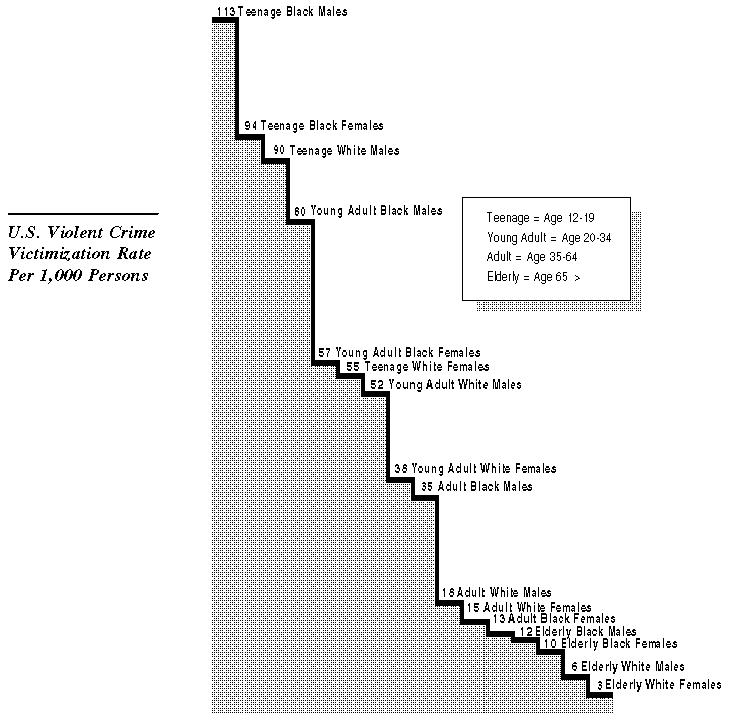 Studies show that groups at the highest risk of becoming victims--young men--are not the ones who generally express the greatest fear of crime--women and the elderly. In fact, men are almost twice as likely as women to be victims of violence, and persons under the age of 20 are almost ten times more likely to be victims than persons over the age of 65. Teenagers--particularly teenage black males--are most often victims of violence and theft. Victims and offenders are of the same race in 80 percent of all violent crimes, and urban dwellers are much more likely to be victims of all types of crime than are persons who live in suburban and rural areas.