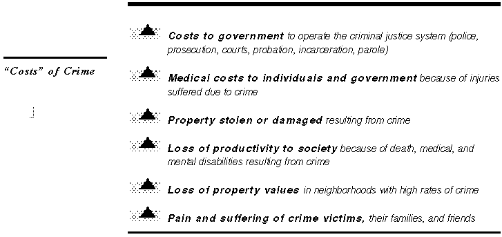 There is much debate about how much crime "costs." Although many studies over the years have attempted to quantify the total direct and indirect costs of crime to government and society, the results have varied widely, but all conclude that the nationwide costs are in the tens to hundreds of billions of dollars annually. The following table identifies the major cost categories of crime.