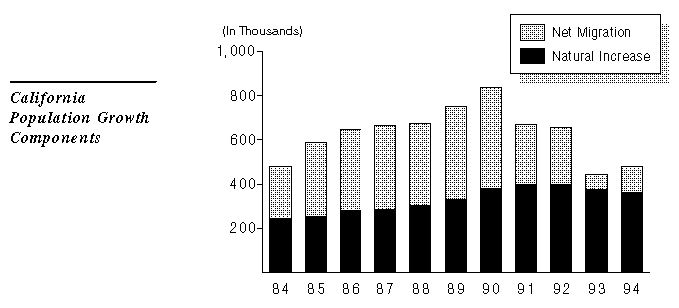 California's population growth was particularly strong from 1985 to 1990, averaging 2.5 percent. This was about three times as fast as the rest of the country.