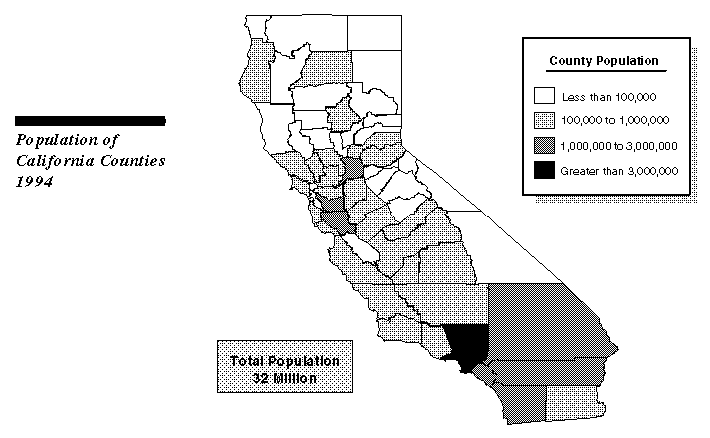 In 1994, California's population reached 32 million, representing 12.6 percent of the nation. By comparison, California had a population of 21 million in 1974, or 9.9 percent of the nation. Thus, over the past 20 years, California's population has grown by 11 million people, or over 50 percent.