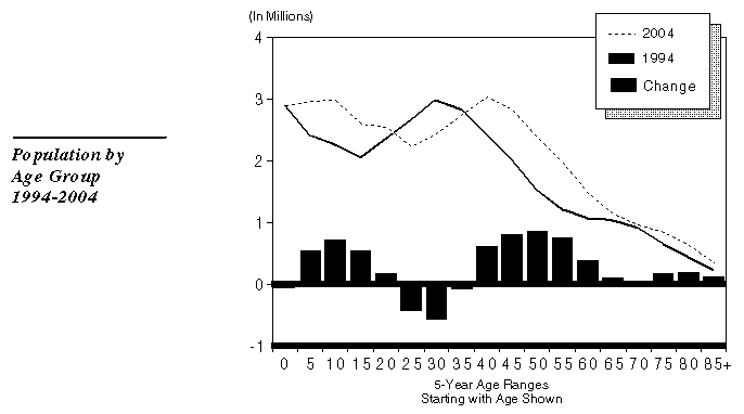 By the year 2004, the number of people between 40 and 60 years old will increase by more than 50 percent as the baby boomers age. Meanwhile, the number of younger adults-- those in their mid-twenties to mid-thirties--will decline over the next ten years. As a result, the average age of California's working-age population (18-65) will increase from 38 to 40.