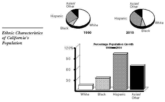 Between 1990 and 2010, California's Hispanic population will double, and the state's Asian population will grow by two-thirds. The projected growth in the state's white (non-Hispanic) population is only 13 percent over the same period, so that by 2010: