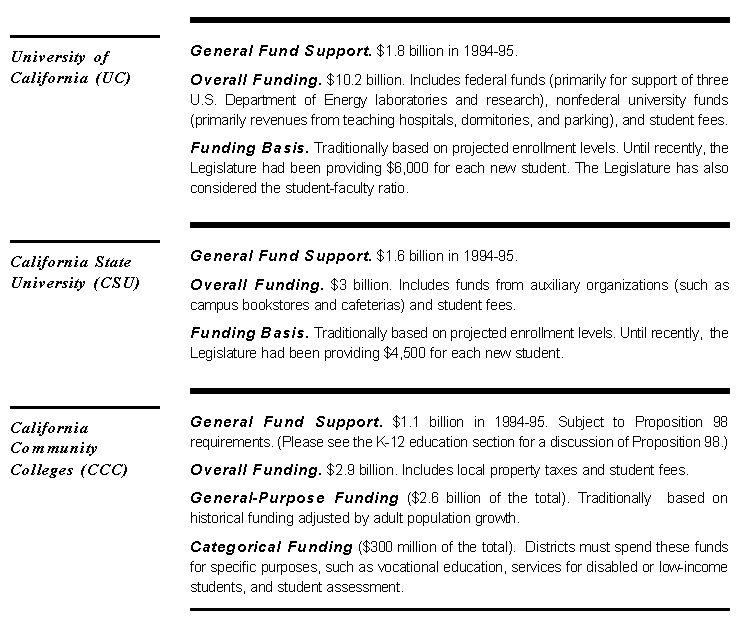 For the UC, the CSU, and the community colleges, the three major state-allocated funding sources are the General Fund, local property taxes, and student fees. From 1988-89 to 1994-95, total support from these funds increased from $6 billion to $7.1 billion.