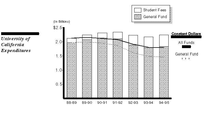University of California. General Fund spending at the UC grew at an average annual rate of 4.1 percent from 1988-89 to 1990-91. Since 1990-91, the fiscal constraints imposed by the state's recession resulted in an average annual reduction in General Fund spending of 3.8 percent (6.9 percent after adjusting for inflation).