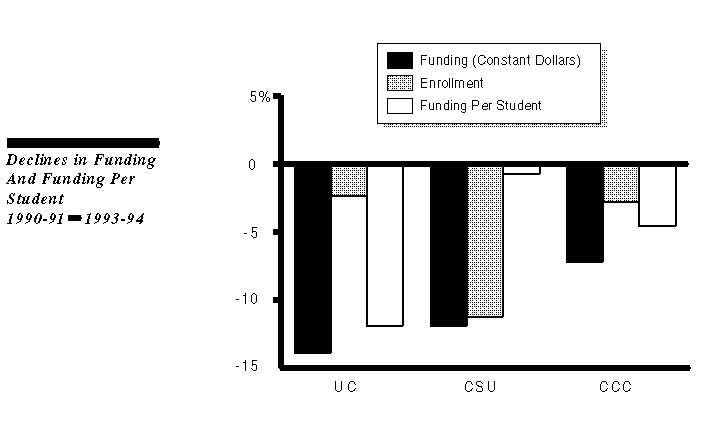 From 1990-91 through 1993-94, the UC and the CSU experienced significant declines in inflation-adjusted funding from the General Fund and net student fees. The UC also experienced a significant decrease in funding per full-time equivalent (FTE) student (12 percent). The CSU, however, experienced only a slight decrease in funding per FTE student. This is primarily because CSU experienced significant enrollment declines (11 percent). Enrollment declines were more modest at UC (2.3 percent).