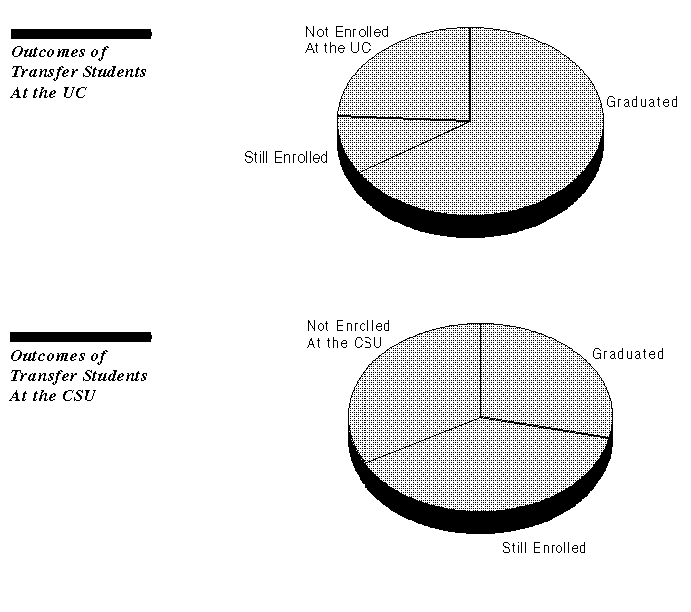 The following charts show the status of students at the UC and the CSU who transferred from a community college, three years after transfer. The data are for students entering the UC and the CSU in fall 1985. Again, the majority had graduated or were still enrolled three years after transferring.