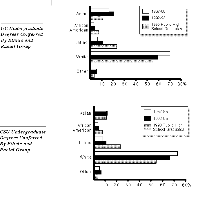 From 1987-88 to 1992-93, the UC and the CSU have experienced increases in the proportions of Latino, Asian, and African-American students graduating with a Bachelor's degree. (The racial and ethnic categories are as reported by the California Postsecondary Education Commission.) These increases generally reflect the increasing diversity of undergraduate enrollments. However, there continue to be disparities between the racial and ethnic diversity of high school graduates compared to UC and CSU graduates.