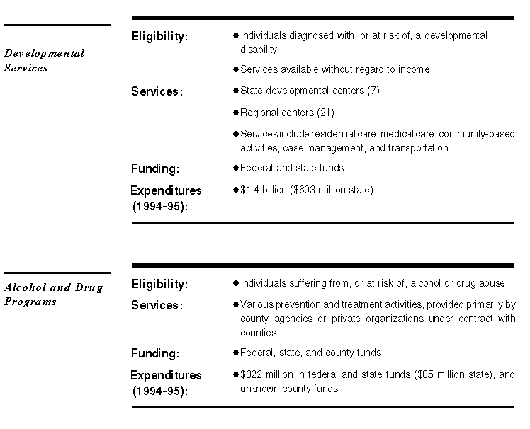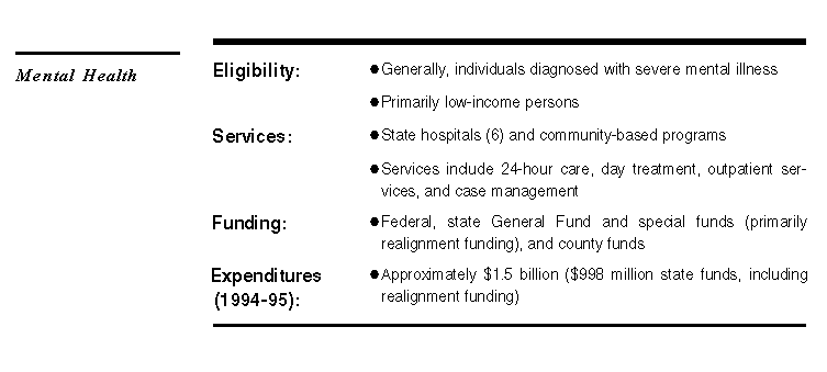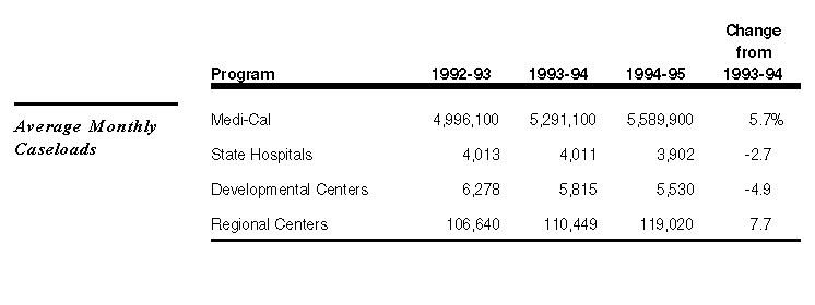 The caseload table shows the average monthly caseloads for the major health programs from 1992-93 through 1994-95 and the annual percentage change between 1993-94 and 1994-95. It shows that Medi-Cal cases (persons eligible for services) and regional center clients are projected to increase, whereas the number of state hospital and developmental center residents is projected to decline.