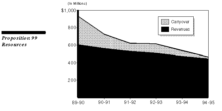 Smoking has declined in California, a trend almost certainly accelerated by the imposition of the surtax in 1989. As a result, annual surtax revenues have declined by about 25 percent in the five years since enactment of the measure--from just over $600 million in 1989-90 to about $450 million for 1994-95. The large carryover balance shown in the figure for 1989-90 and 1990-91 was due to the accumulation of revenues in advance of program expenditures.
