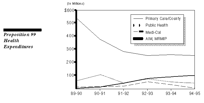 Due to the continuing drop in revenues, overall expenditures supported by the Proposition 99 surtax have declined significantly since passage of the measure. Expenditures for most primary care activities and for county indigent health services have absorbed most of the decline, in part because they accounted for the largest portion of expenditures. For example, funding for the California Healthcare for Indigents Program, the major Proposition 99 program for county indigents, has declined by half since 1989-90 (from $337 million to about $160 million in 1994-95). Expenditures for public health and health education also have declined since 1990-91, although funding for one of these programs--the anti-smoking media campaign--has remained relatively steady.