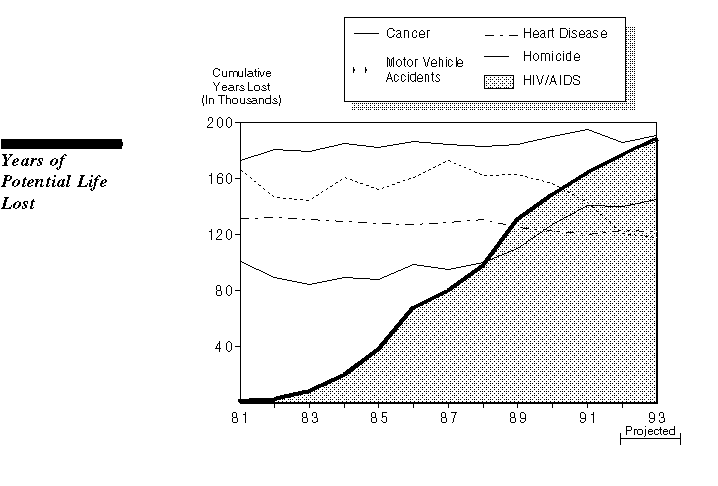 The number of years of potential life lost due to Acquired Immune Deficiency Syndrome (AIDS) has risen dramatically over the past ten years. Death from AIDS was the fifth highest cause of lost years of life in 1988; by 1991, it had climbed to second--behind cancer.