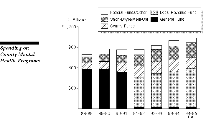 Total spending on county mental health programs has increased from $865 million in 1990-91 to an estimated $1 billion in 1994-95, which is an average annual increase of 4.7 percent. The chart also shows that the Short-Doyle/Medi-Cal program--which provides federal reimbursements to counties for mental health services to Medi-Cal beneficiaries--nearly doubled during that same time period due primarily to expansion of the number of services eligible for reimbursement. The 1991-92 realignment legislation eliminated a total of $750 million in General Fund support for mental health services and established a Local Revenue Fund (state sales tax and vehicle license fee revenues) to support the increased financial obligations of counties.