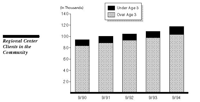 Individuals with developmental disabilities reside in developmental centers (DCs) or receive services in the community through regional centers. As shown in the graph, the number of clients residing in the community has been increasing in recent years, and will grow significantly (23 percent) between 1993 and 1994 for clients under three years of age. This was due primarily to the implementation, in October 1993, of Part H of the federal Individuals with Disabilities Education Act, which: