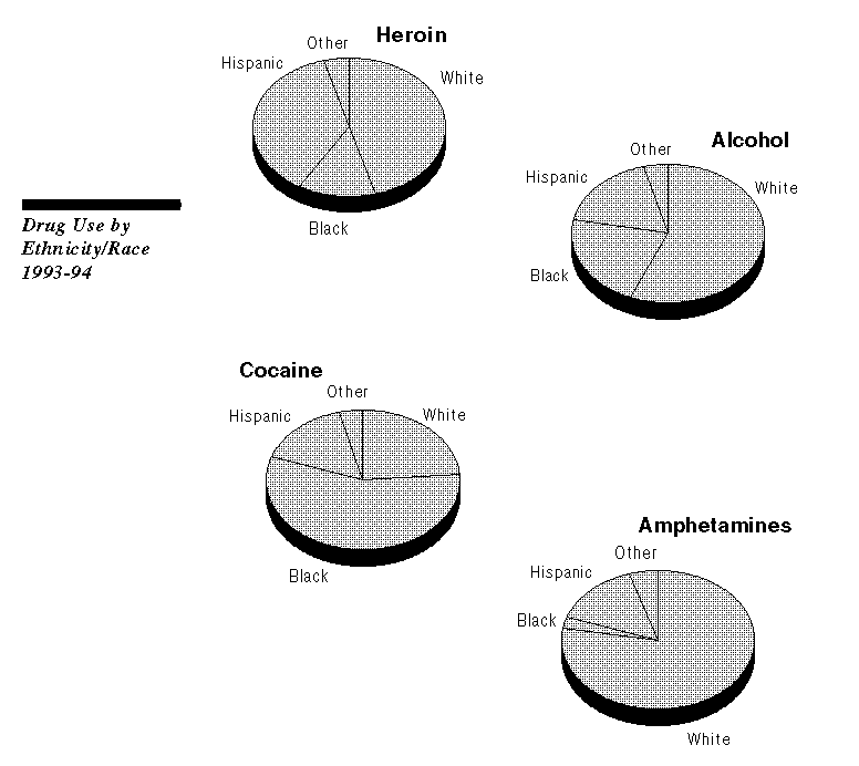 The figures show that Whites constituted 78 percent of amphetamine users, 57 percent of alcohol users, and 45 percent of heroin users entering treatment programs. On the other hand, Blacks were 57 percent of cocaine treatment admissions and 13 percent of heroin admissions.