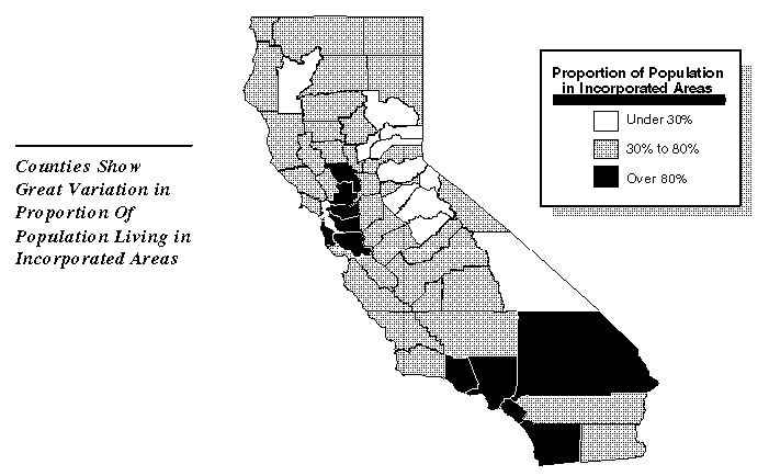 As shown below, 12 counties have more than 80 percent of their population living in cities. These counties generally tend to be the most populous counties in the state, but some smaller counties also are highly incorporated, due to the adoption of growth management policies. In contrast, three counties--Alpine, Mariposa, and Trinity--have no cities. Consequently, all municipal services in these counties are provided by the county, or by special districts.