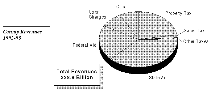 County revenues are derived primarily from state-controlled sources, including program-specific state aid, the property tax, and sales tax. In fact, state aid alone accounts for over one-third of county resources. Generally, counties have little control over how this money is spent.