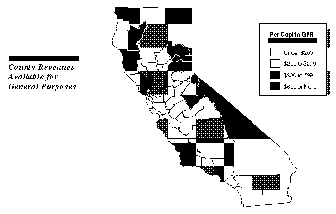 The amount of GPR available to cover state-required program costs and local services in counties varies significantly. In fact, we estimate that in 1992-93 GPR ranged from less than $200 per capita in San Bernardino County to about $2,460 per capita in Alpine County. The statewide average GPR per capita in 1992-93 was roughly $279, excluding San Francisco (which as a city and county is not comparable to other counties), with over 80 percent of counties having per capita GPR of $200 - $500. The figure below illustrates this wide disparity in county GPR.