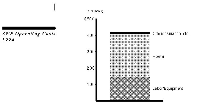 For 1994, costs to operate and maintain the SWP will total about $416 million. Most of these funds pay for labor and equipment, and for the cost of power to operate pumping stations. As with the cost of construction, fees paid by contractors cover about 96 percent of the annual cost of operating the SWP.