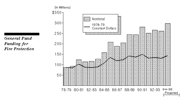 The most significant rate of increase in the cost of fire protection has been in emergency fire suppression. The CDFFP incurs these costs, which can fluctuate widely from year to year, in fighting large fires or in keeping field staff and equipment at full strength during times of high fire activity. When adjusted for inflation (1985-86 dollars), the cost of emergency fire suppression (not shown in chart) increased from 1985 to 1991 by about 12 percent or $3.4 million.