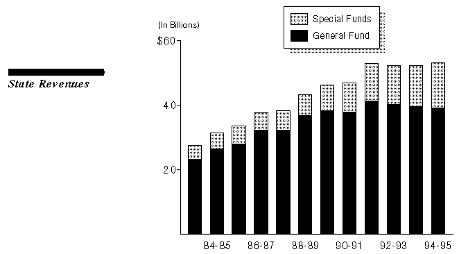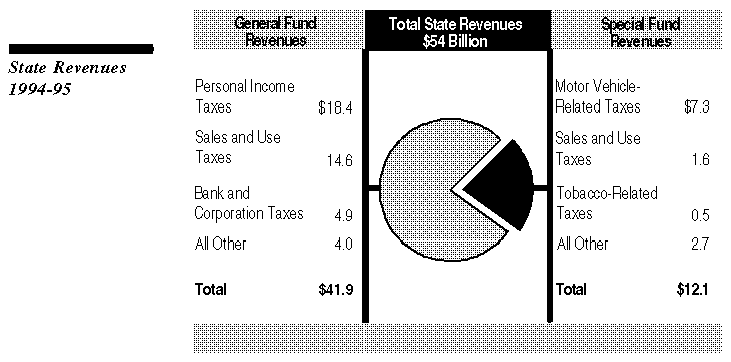 Total state revenues are estimated at $54 billion for 1994-95. Of this, nearly 80 percent are General Fund revenues and about 20 percent are special fund revenues.