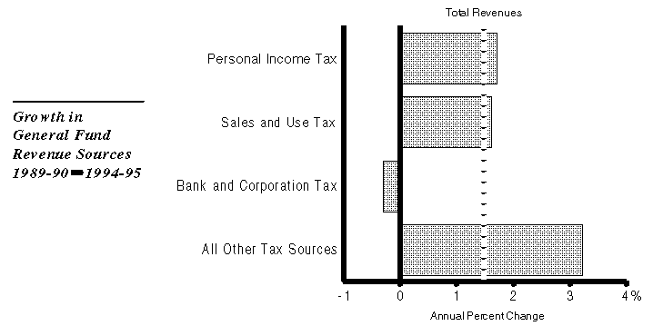 Although average growth has been relatively slow for both personal income taxes (1.7 percent) and sales and use taxes (1.6 percent), the greatest weakness has been in bank and corporation tax revenues. These experienced an absolute decline over the period.
