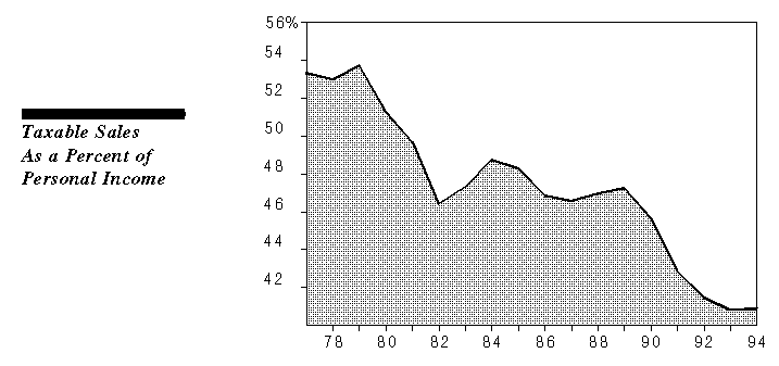 Taxable sales as a percent of personal income generally has followed a downward trend over the past 15-plus years.