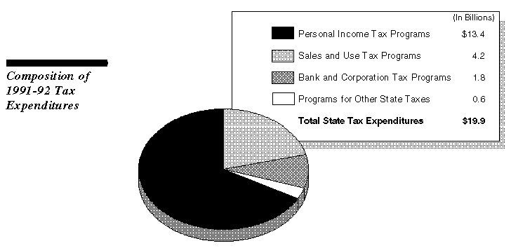 Personal income tax TEPs amounted to over $13 billion in 1991-92, or two- thirds of the cost of all state-level TEPs. Sales and use tax TEPs accounted for another 20 percent, and other taxes for the remaining 12 percent.