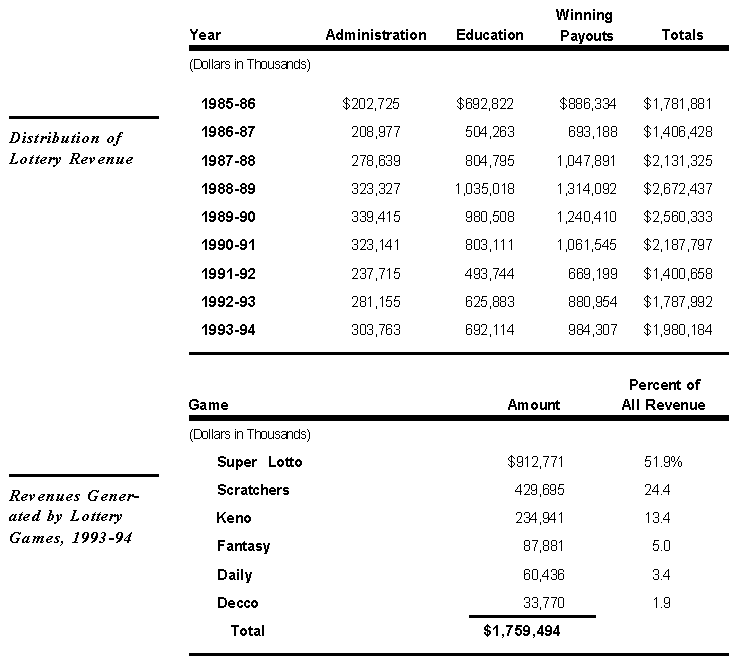 As indicated below, in 1993-94 the Super Lotto game generated over half of State Lottery revenues. Scratchers were the next most popular game, producing about a quarter of State Lottery revenues.