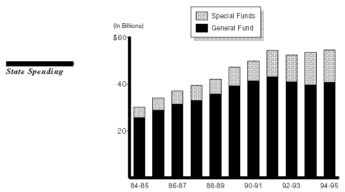 Total spending grew at an annual rate of 8.7 percent from 1984-85 to 1991-92. Since 1991-92, however, the fiscal constraints imposed by the state's recession have kept total spending essentially flat. After adjusting for inflation, total spending in constant dollars has fallen by 6 percent since 1991-92.