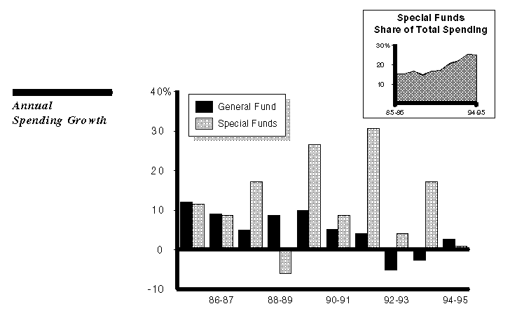 The 1994-95 budget is an exception to recent trends, in that special fund spending growth is less than General Fund spending growth. This reflects: (1) slow growth in ongoing revenues, (2) transfers of some special fund revenues to the General Fund, and (3) no new funding shifts or special fund programs in 1994-95.