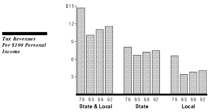 State and local taxes per $100 of personal income have risen somewhat since the early 1980s after falling sharply due to Proposition 13, based on data for the period 1977-78 through 1991-92 from the U.S. Department of Commerce.