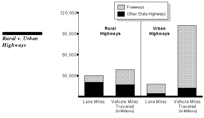 As the figure illustrates, the rural portion of the state highway system has over 30,000 lane-miles of roads, but most of these are nonfreeway roads (lower-speed roads, often with traffic lights or stop signs). In contrast, the urban highway system is only about 18,000 lane- miles, but most of these miles are high-speed freeways. Traffic volumes, measured in vehicle miles traveled, are much higher on the urban system, in spite of its smaller size; the highest traffic volumes are found on urban freeways.