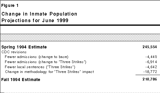 In total, about 30,000 of the 35,000 reduction in estimated inmate population is due to the CDC's revised estimate of the impact of the Three Strikes law. The CDC is currently evaluating whether there are likely to be changes in the long-term impact of this law. (The department's spring 1994 long-term assessment was that Three Strikes would eventually increase inmate population by 275,000 in 2026-27.)
