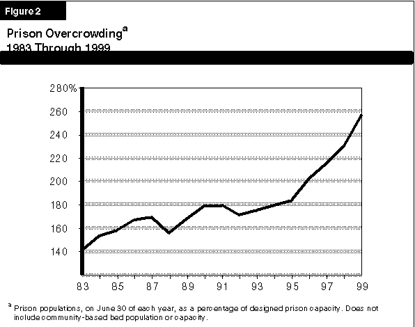 Figure 2 shows recent and projected overcrowding levels in the state prison system based on the scheduled completion of all authorized prisons. As shown in the figure, prison overcrowding increased from about 140 percent in June 1983 to around 180 percent in June 1990 and has remained fairly close to that level over the last four years as additional prisons have been opened. Based on the CDC's fall 1994 population projections, unless more prisons are built, overcrowding in the prisons will increase significantly over the next five years and will reach 256 percent in mid-1999 nearly three inmates for each space designed to house one inmate.