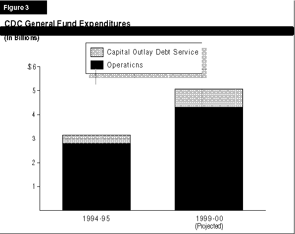 In the current year, the General Fund cost of the CDC is about 7.6 percent of estimated General Fund revenues. For the CDC's expenditures to be an equal percentage in 1999-00, General Fund revenues would have to grow by an average of 10 percent per year. Given the state's current tax structure and economic outlook, revenue growth will probably not be this large. For example, in the 1980s when the state enjoyed relatively strong economic growth General Fund revenues increased by an average of 8 percent per year. It is therefore likely that operating the state's prison system will require an increasing portion of state revenues.
