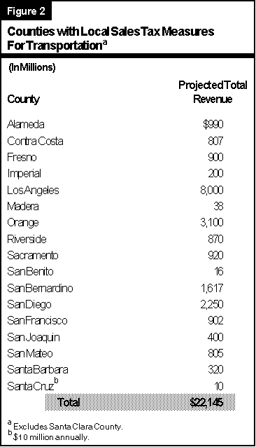 Currently, 17 other counties levy at least one one-half cent local sales tax for transportation purposes. In all except two counties (Riverside and San Benito), the tax was approved by a majority, not a two-thirds, vote. Figure 2 shows these 17 counties with increased sales taxes for transportation and the amount of revenues projected to be generated.